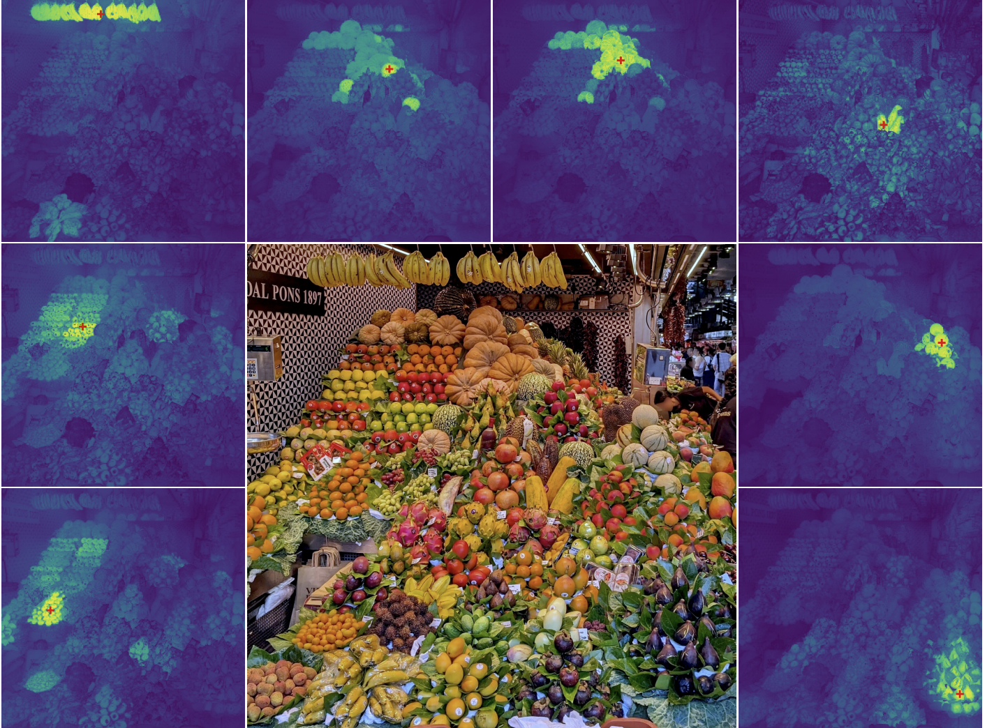 위의 이미지에서 DINOv3가 4K 이미지에 대해서도 semantic한 정보를 잘 유지하는 것을 확인 할 수 있습니다. 이미지는 빨간 + 부분에 대하여 주변 특징정보들의 코사인 유사도를 시각화 한 결과 입니다.