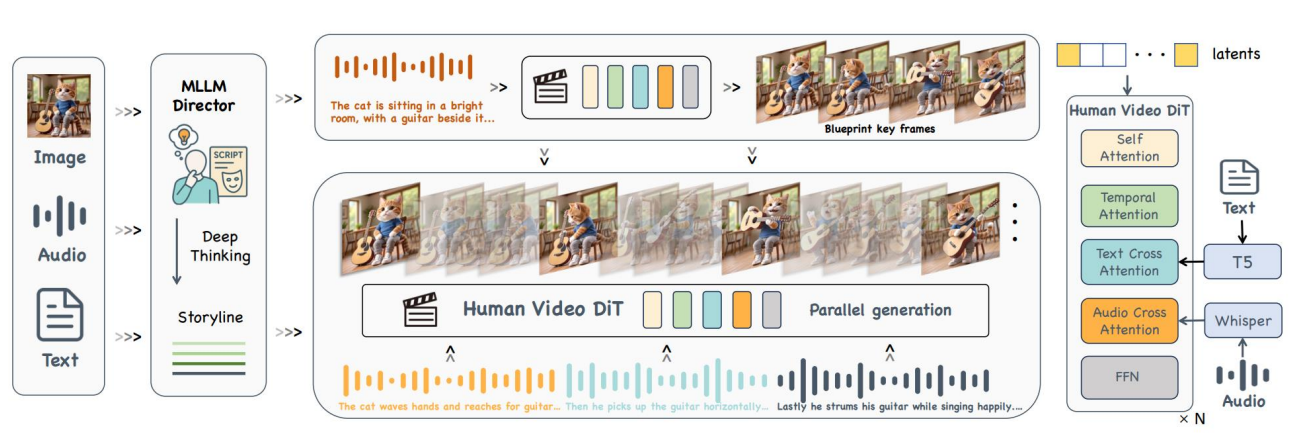 Kling-Avatar는 이러한 불일치를 제거하기 위해, MLLM Director를 도입해 오디오·이미지·텍스트 지시를 통합적으로 이해하고, 이를 기반으로 스토리라인을 구성합니다. 그 결과 아바타는 단순한 입모양 합성을 넘어, 감정·행동·카메라 무빙까지 일관성 있게 표현할 수 있습니다.