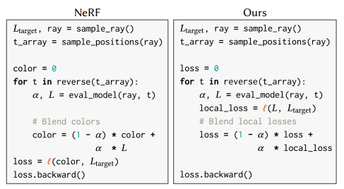 NeRF는 색상을 블랜딩 한다면 5D Radiance Field Loss는 손실을 블렌딩 합니다. 수도코드를 보다시피 단 몇 줄의 코드 변경만으로 exponential volume 대신 explicit surfaces을 생성했습니다.