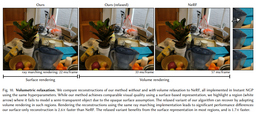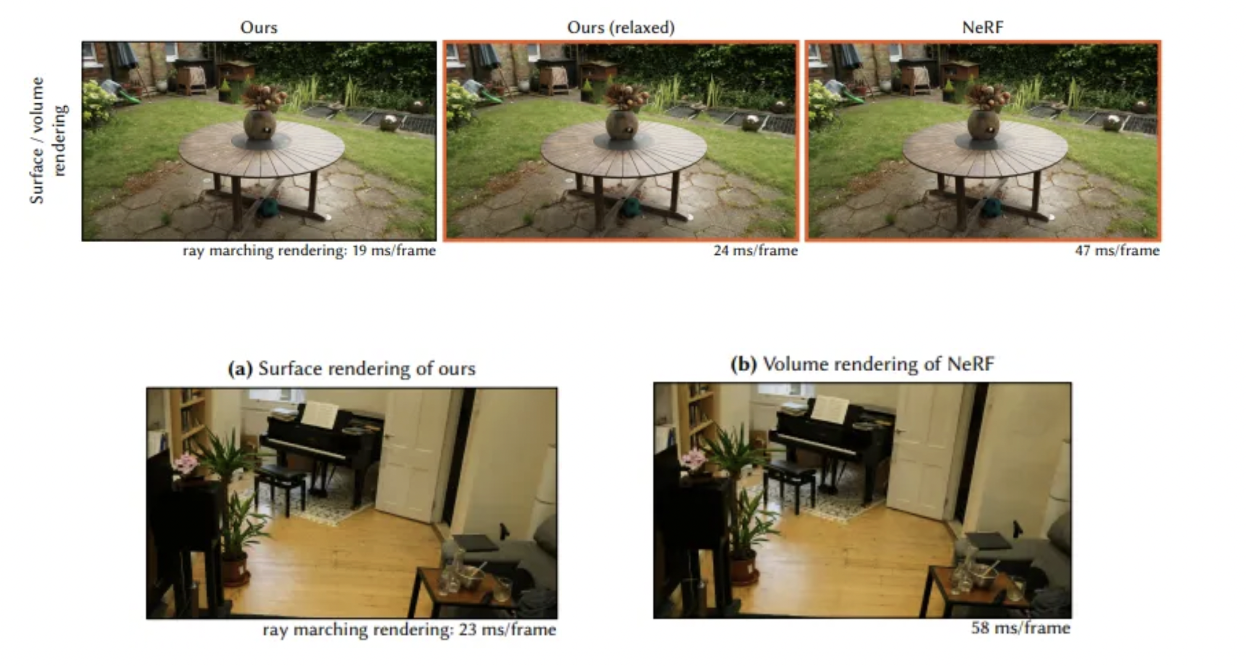 기존 NeRF와 비교해봤을 때, 기존 볼륨 기반 방법 대비 평균 0.1 dB 낮은 수준이지만, 사실상 동일한 품질 유지하며 NeRF 계열 방법의 빠른 학습 속도를 그대로 유지했습니다. 또한, 기존처럼 부피(volumetric) 표현을 후처리로 표면 추출하는 게 아니라, 학습 과정에서 곧바로 명시적인 표면 이 형성될 수 있습니다.